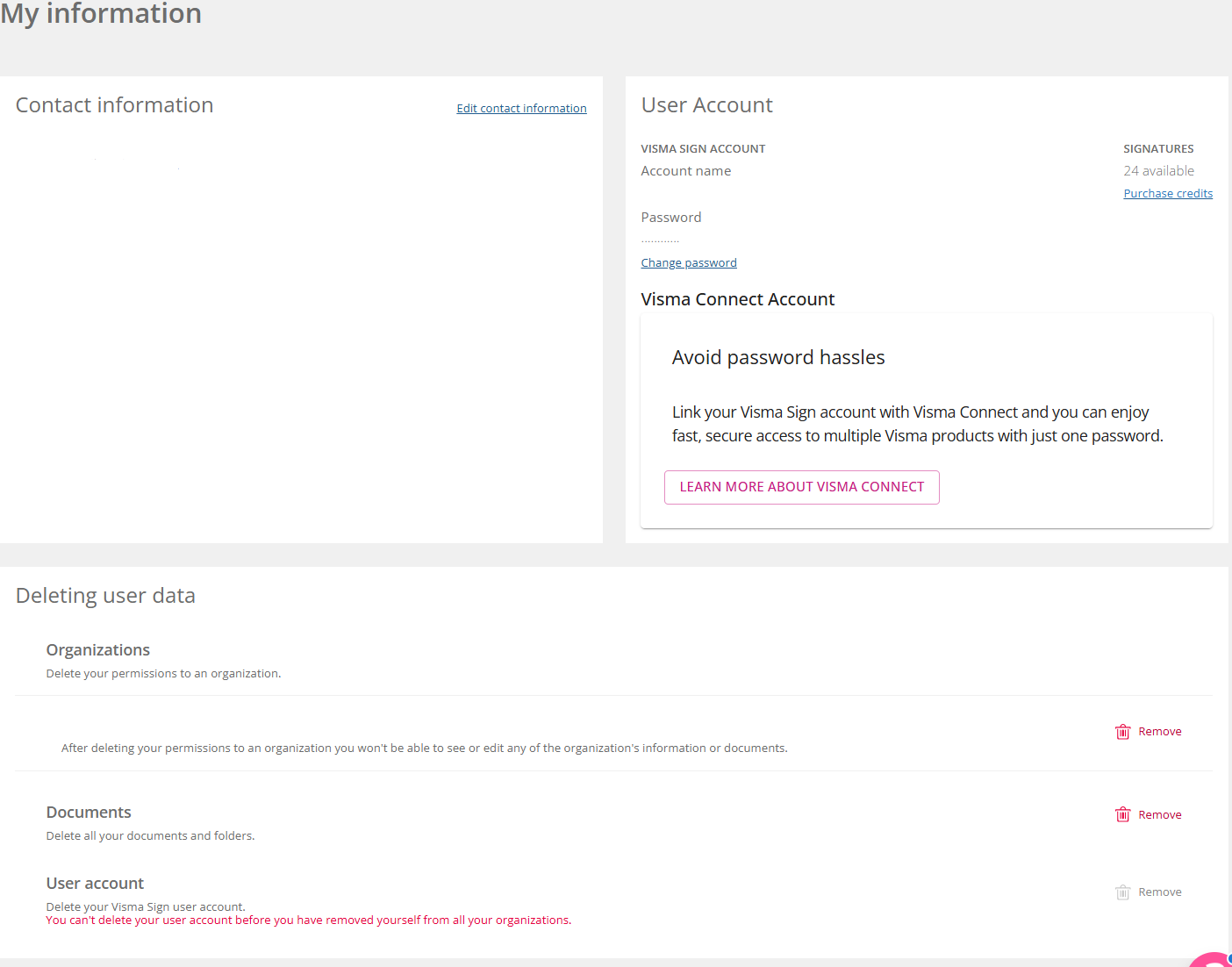 Please note that the email address used as the Visma sign username cannot be edited through the My information section. You need to re-register for the service to change the email address. Detailed instructions can be found in the guide: How do I change my email address?