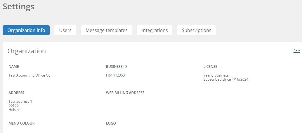 The company's basic data can be updated with the company's admin user rights. With the exception of the Business id, the admin can edit all company information.