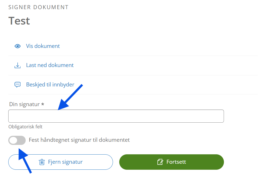 Invitasjonen åpnes på samme måte som et dokument som krever bruk av bankid, men i signaturfasen velges ikke en identifikasjonsmetode, men signaturen skrives med tastaturet i det angitte feltet. I tillegg kan en tegnet signatur legges til, som etterligner en håndskrevet signatur.